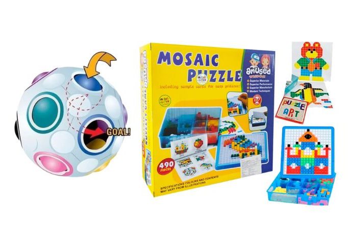 Incluye dos divertidos juegos de concentración, que lograran que tu pequeño deje las pantallas. Puzzle mosaico con plantillas y catalogo + pop it pelota.