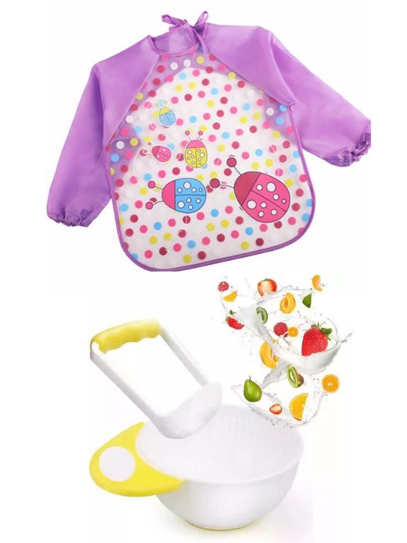 Incluye: Plato aplasta papilla en color amarillo y mandil impermeable (modelos a elegir)